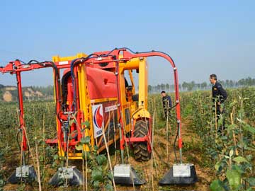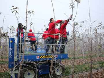 12月23日,陕西省农村网记者、千阳县电视台一行深入宝鸡华圣公司基地进行新闻采访。 记者一行在基地负责人的陪同下来到展示园内,此时正值公司开展果树冬季修剪工作,记者看到4名技术人员在修剪平台上对果树进行冬剪,修剪平台配备气剪,每分钟可修剪约16棵果树,工作效率极高给人留下深刻印象,记者对现场进行了影像拍摄。随后,记者采访了基地负责人,就基地建设情况、苗圃和果园栽培管理技术进行详细了解。最后,一行人观摩了公司引进国外的先进设备,包括:种植机、起苗机、起垄机、除草剂机、采收平台等,并一一对设备功能特性进行介绍,设备精良,技术先进令人叹为观止。 记者纷纷表示:华圣苗木培育技术从种植、打药、除草、松土、修剪、直到起苗、果实采收全程均为机械操作,果园机械化水平处于国内领先水平!