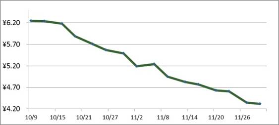 2012年苹果收购价格开始时较高,但很快回落,收购价格大大低于2011年。2012年苹果收购价格低的主要原因:全国苹果产量大,供大于求,经营者连年亏,收果的果商少了,买的人少、卖的人多,和前两年收购时的情形反过来了。收购价格低和收购量少,也促使果农自存果比例增加。苹果(红富士,80#二级以上)收购价格情况见下图: