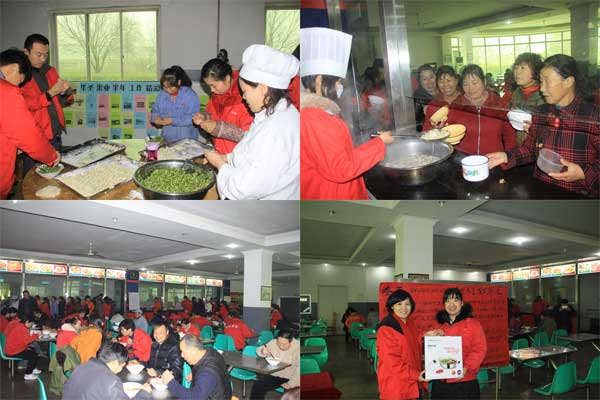 2013年12月22日是传统节气——冬至,为了让大家吃到可口的水饺,餐厅师傅们利用业余时间提前20天包制了各种各样的水饺。冬至前两天,午餐时间,员工们吃上了热气腾腾的饺子, 为了活跃员工就餐气氛,在吃饺子的同时,把15个象征着幸运的“开口杏”分别包制在十五个水饺中,十五名吃到包有开口杏水饺的员工幸运中奖,他们兴高采烈地领到一个不锈钢鸳鸯火锅。