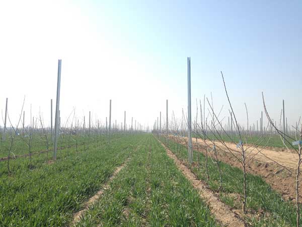 临清市地处东经115°42′,北纬36°61′,海拔29~38m,属温带季风气候,年均降雨量550mm,年日照2661.7h,果园所处刘垓子镇土壤类型为潮土。由于该区域此前从未栽植果树,果农对果树栽培知识缺乏了解,技术人员根据不同区域不同的气候条件和土壤环境制定对应的技术指导方案,并不时地和果农进行沟通和交流,向果农详细的传授果树栽培知识。