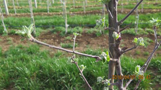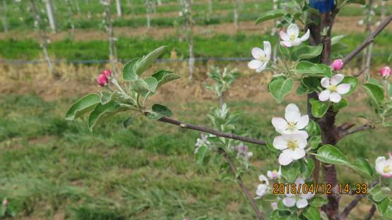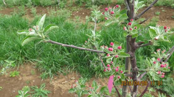 经过一年时间的观察,莫迪品种表现良好,经统计定植第一年单株挂果5-7个,株高增加40-50cm,花芽饱满。定植第二年物候期与富士一致,单株花量达35-40个。