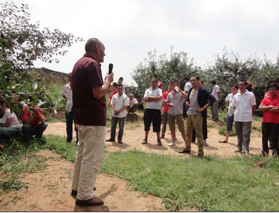 由于寇贺东这几年种果树种出了名气,吸引了众多省市县有关果业专家和附近村民、甚至外县果农的眼球,纷纷前来考察和观摩学习。就在8月3日,在华圣三农公司富县总站和黄陵总站的协调组织下,富县各乡镇的近百名果农乘车前来寇贺东的“华圣亩产万斤示范园”取经。在听了老寇的经验介绍,看了他家果园的长势情况后,大家对他能在陕北黄土旱塬上种出亩产万斤的果园赞不绝口,说常听到“施华圣配方肥,亩产万斤不是梦”的宣传,还认为不可能,这下亲眼见到亩产万斤园,回去后就照老寇的办法干,施用华圣配方肥,加大投入和科学管理力度,争取把自家果园亩产提上去。